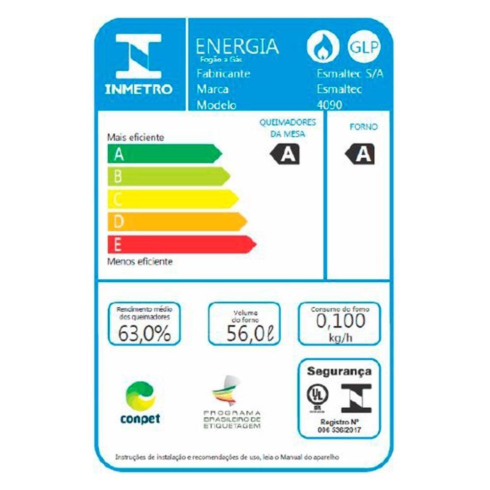 Características do Produto: Marca: Esmaltec Tipo de Fogão: Piso Quantidade de Bocas:4 Bocas Quantidade de Fornos: 1 Forno Acendimento Automático: Sim Chama Especial: Não Altura:72,1 cm Largura:50,7 cm Profundidade: 59,8 cm Tipo de Selo Inmetro: Procel Classificação Energética: A Cor: Preto Modelo: Agata Glass Fabricante: Esmaltec Voltagem: Bivolt