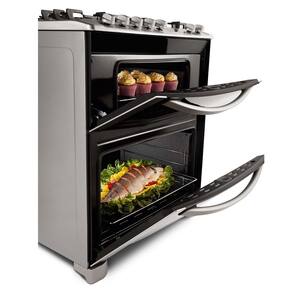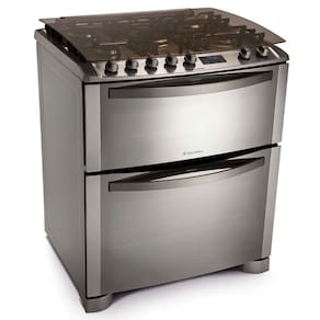 Mais resistente e bonito, esse fogão conta com um queimador tripla-chama, que proporciona maior rapidez no preparo dos alimentos. Permite cozinhar receitas maiores, duplo forno para assar duas receitas diferentes ao mesmo tempo, praticidade e economia de tempo, os fornos são totalmente independentes, e acendimento super-automático, ignição rápida, fácil e segura, sem riscos de queimaduras. Basta pressionar a tecla de acendimento e girar o botão de controle.