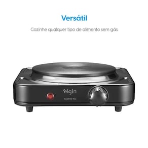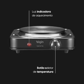 Fogão Portátil de Mesa com 1 Boca Elgin 110V. Com design compacto, é uma ótima alternativa para preparar seus alimentos em locais onde o uso do gás de cozinha é limitado. Possui placa de aquecimento de 1.000W de potência para você preparar todos os tipos de comida e é compatível com qualquer panela. Conta com controle de temperatura ajustável com 5 níveis, seu desempenho é similar ao de um fogão a gás. Também possui indicação luminosa de aquecimento e termostato para evitar superaquecimento, esquenta mais rápido e mantém a temperatura por mais tempo. Super resistente e fácil de limpar. Sua base é estável proporcionando mais firmeza e segurança. Pode ser transportado para qualquer lugar.Luz de calor residual