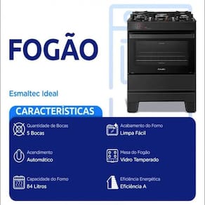 Fogão esmaltec ideal top 5 bocas automático mesa de vidro: O Fogão 5 Bocas Esmaltec Ideal Top é um modelo moderno e prático, ideal para quem busca eficiência e conforto na cozinha. Sua mesa de vidro com espaldar oferece um design sofisticado e facilita a limpeza, mantendo sua cozinha mais organizada e com um visual elegante. O fogão é equipado com acendimento automático, que garante mais praticidade e durante o uso, eliminando a necessidade de fósforos ou isqueiros.