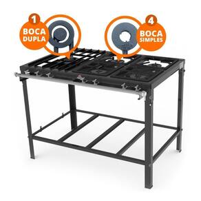 Tipo de montagem: De piso | Quantidade de Bocas: 5 | Alimentação: a gás | Cor: Preto | Tipo de Instalação: Desmontável