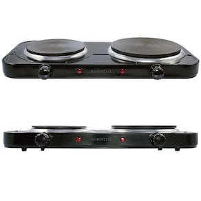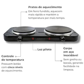 Fogareiro elétrico portátil com 2 bocas, potência total de 2500W (boca média 1000W, boca grande 1500W). Funciona com eletricidade, sem necessidade de gás. Possui controle de temperatura independente por prato, luz piloto e resistência blindada. Ideal para uso doméstico e camping.Tipo
