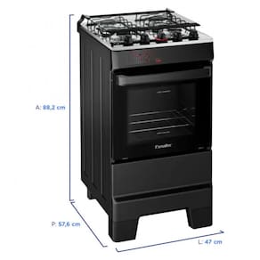 Queimadores: Com trempes duplas em aço esmaltado, ele é altamente durável e resistente ao desgaste do tempo, além de proporcionar maior estabilidade ao acomodar as panelas. A distribuição de potência dos queimadores é otimizada para atender a diferentes necessidades culinárias: dois queimadores para uso familiar, com potência de 2,0 kW cada, e dois queimadores pequenos com potência de 1,7 kW.