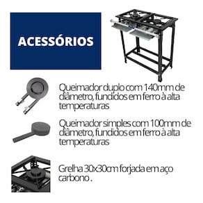 Fogão Industrial 2 Bocas Baixa Pressão P5 JCN Praticidade e durabilidade são ingredientes que tem estar em sua cozinha industrial, e é examente isso que os fogões industriais da JCN entregam. Fabricado para durar, o fogão 2 bocas baixa pressão P5 com forno da JCN possui grelhas em ferro fundido, além de contar com 1 queimadores simples e 1 queimadores duplo para reduzir o tempo de cozinhamento e atender sua demanda rapidamente! Afinal, um fogão industrial de baixa pressão é uma ótima escolha, com sua alta potência e eficiência energética, é capaz de lidar com grandes volumes de alimentos. Construído com materiais duráveis ??e de fácil limpeza, oferece controle preciso de temperatura e é perfeito para estabelecimentos movimentados que requerem desempenho confiável e eficiência. Ideal para bares, lanchonetes e restaurantes ou áreas de lazer, garantindo uma maior praticidade e qualidade no cozimento de grande quantidade de alimento. Conheça melhor o Fogão Industrial 2 Bocas Baixa Pressão P5 JCN Especificações Técnicas Material da Estrutura: Chapa de Aço Carbono Material do Registro Regulador de Gás: Zincado Material do Queimador: Ferro Fundido à alta temperatura Material dos Pés: Aço Carbono Desmontáveis e Sapatilhas de Borracha Antiderrapante Grelha: 30x30cm em Aço Carbono Mesa: Perfil 5 (50mm) Pintura: Preto Texturizado Funcionamento: À Gás Acendimento: Manual Pressão do Gás: Baixa Pressão Queimadores: 1 Queimador Simples e 1 Queimador Duplo Consumo: 300gr/hr por queimador queimador simples e 600gr/hr por queimador duplo Medidas do Produto Montado Altura: 82cm Largura: 74cm Profundidade: 49cm Peso: 16kg Garantia 3 meses contra defeito de fabricação
