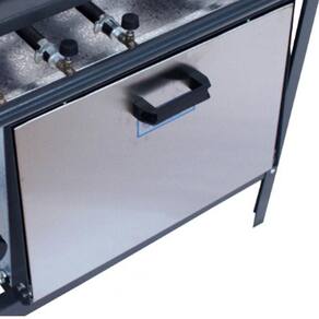 Este fogão 2 bocas alta pressão possui quadro superior estampado com perfil de 5 cm entre as grelhas e pintura eletrostática a pó, proporcionando maior durabilidade e resistência ao produto. Conta com registro em Zamac de alta qualidade para instalação do gás, além de queimadores em ferro fundido com 110 mm de diâmetro, grelhas de 30x30 em ferro fundido de 4 pontas e tubo de distribuição de gás soldado à estrutura do fogão. Além disso, também possui uma bandeja coletora de resíduos em chapa de aço galvanizado para melhor utilização do fogão industrial com forno.