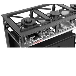 Este fogão profissional possui três bocas, sendo duas simples e uma dupla, além de uma estrutura reforçada, fabricada em aço carbono com vincos e dobras para ganho de resistência. Também conta com acabamento em pintura eletrostática epóxi (tinta atóxica e não inflamável) e funcionamento a gás baixa pressão.