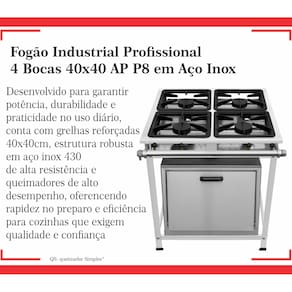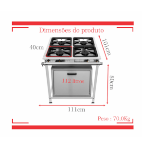 Fogão Industrial de Alta Pressão À Gás GLP (BOTIJÃO)Linha Luxo Inox Perfil 8Grelhas em ferro fundido 40cmx40cm4 Queimadores Simples 130mmBandeja coletora de resíduoChapa em aço Inox 430Forno de 112L Tampa em Aço InoxMedidas do Fogão Montado:Altura : 80cmLargura : 111cmProfundidade : 101cm Marca: Não Informado Ean: 7890164500675