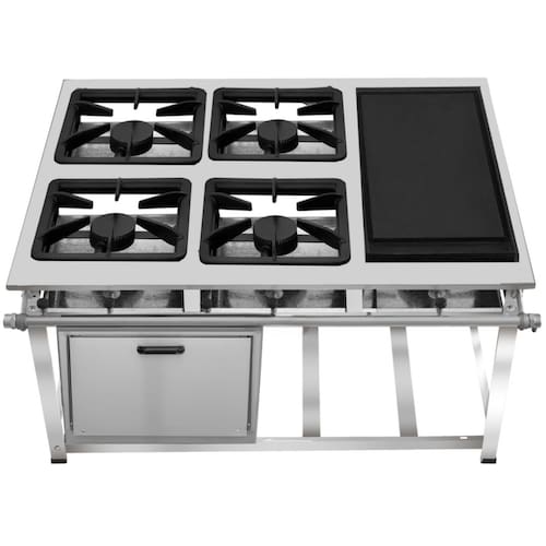 Fogão Industrial de Baixa Pressão À Gás GLP (BOTIJÃO)Linha Standard Perfil 5Grelhas em ferro fundido 30cmx30cm2 Queimadores Duplos 140mm 2 Simples 100mmBandeja coletora de resíduoChapa em aço Inox 430Forno de 92L Tampa em Aço InoxMedidas do Fogão Montado:Altura : 80cmLargura : 107cmProfundidade : 80cm