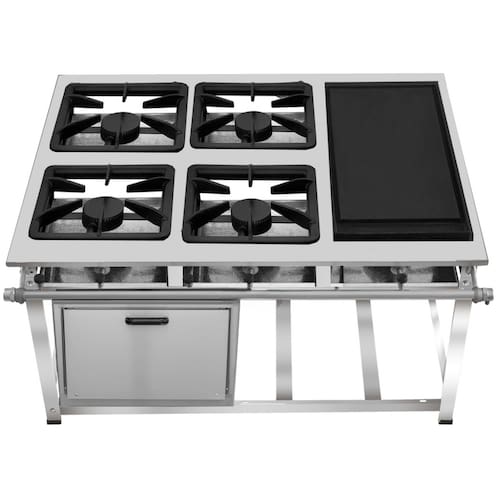 Fogão Industrial de Baixa Pressão À Gás GLP (BOTIJÃO)Linha Tradicional Perfil 7Grelhas em ferro fundido 30cmx30cm2 Queimadores Duplos 170mm 2 Simples 130mmBandeja coletora de resíduoChapa em aço Inox 430Forno de 92L Tampa em Aço InoxMedidas do Fogão Montado:Altura : 80cmLargura : 115cmProfundidade : 83cm