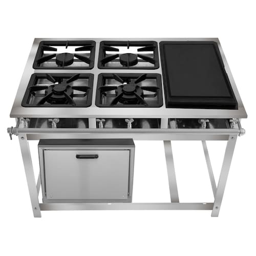 Fogão Industrial de Baixa Pressão À Gás GLP (BOTIJÃO)Linha Tradicional Perfil 7Grelhas em ferro fundido 30cmx30cm2 Queimadores Duplos 170mm 2 Simples 130mmBandeja coletora de resíduoChapa em aço Inox 430Forno de 92L Tampa em Aço InoxMedidas do Fogão Montado:Altura : 80cmLargura : 115cmProfundidade : 83cm