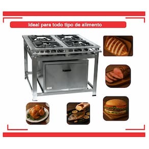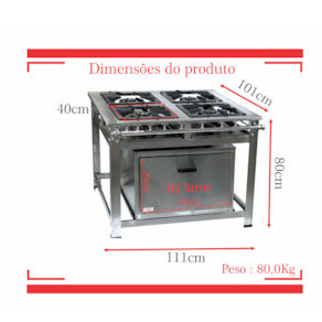 Fogão Industrial de Baixa Pressão À Gás GLP (BOTIJÃO)Linha Luxo Inox Perfil 8Grelhas em ferro fundido 40cmx40cm4 Queimadores Triplos 170mmBandeja coletora de resíduoChapa em aço Inox 430Forno de 92L Tampa em Aço InoxMedidas do Fogão Montado:Altura : 80cmLargura : 111cmProfundidade : 101cm Marca: Não Informado Ean: 7891077836523