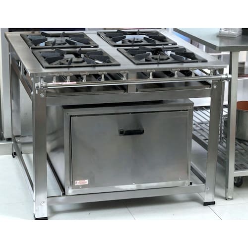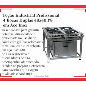 Fogão Industrial de Baixa Pressão À Gás GLP (BOTIJÃO)Linha Luxo Inox Perfil 8Grelhas em ferro fundido 40cmx40cm4 Queimadores Duplos 170mmBandeja coletora de resíduoChapa em aço Inox 430Forno de 92L Tampa em Aço InoxMedidas do Fogão Montado:Altura : 80cmLargura : 111cmProfundidade : 101cm