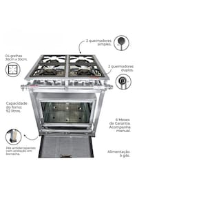 Fogão Industrial 4 Bocas 30x30 P5 em Aço Inox02 Queimadores Simples 100mm02 Queimadores Duplos 140mmEstrutura Confeccionada em Aço Inox 430Grades em Ferro Fundido Queimadores em Ferro FundidoPerfil 5 (5cm Entre os Queimadores) Forno de 92L Tampa de Vidro Garantia : 06 Meses Contra Defeitos de Fabricação.Medidas:Altura : 80cmLargura : 73cm Profundidade : 80cm Marca: Não Informado