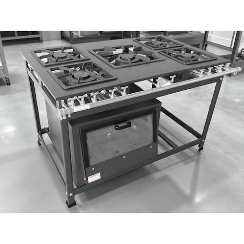 Fogão Industrial de Baixa Pressão à Gás GLP (BOTIJÃO) Linha Tradicional Mesa Perfil 7 Grelhas em ferro fundido 30x30cm Grelha Central em ferro fundido 40x40cm 05 Queimadores Duplos 170mm Bandeja coletora de resíduo em Aço Galvanizado Estrutura em Aço Carbono Cor: Cinza Grafite