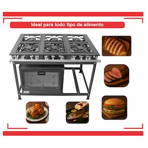Fogão Industrial 6 Bocas 30x30 P5 Com Forno03 Queimadores Triplos 140mm03 Queimadores Simples 100mmGrelhas em Ferro Fundido Queimadores em Ferro Fundido Estrutura Confeccionada em Aço CarbonoPintura Eletrostatica Forno de 92L Tampa de VidroPerfil 5 (5cm Entre os Queimadores) Garantia : 06 Meses Contra Defeitos de Fabricação.Medidas :Altura : 80cmLargura : 107cmProfundidade : 83cm