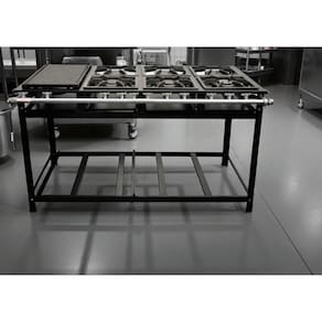 Fogão Industrial de Baixa Pressão À Gás GLP (BOTIJÃO)Linha Tradicional Perfil 7Grelhas em ferro fundido 30cmx30cm3 Queimadores Triplos 170mm 3 Simples 130mmBandeja coletora de resíduoPintura preta texturizada epóxi de alta resistênciaChapa em aço carbonoMedidas do Fogão Montado:Altura : 80cmLargura : 151cmProfundidade : 88cm