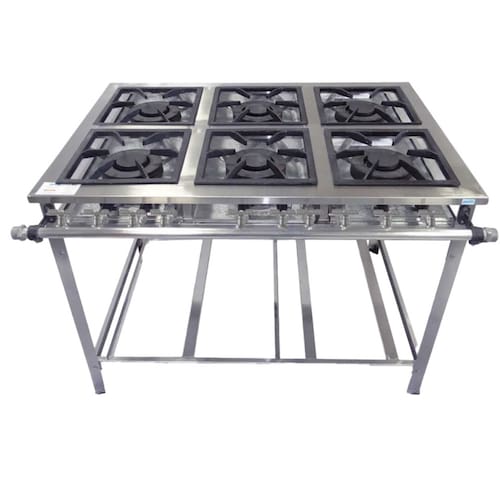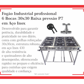 Fogão Industrial de Baixa Pressão À Gás GLP (BOTIJÃO)Linha Tradicional Perfil 7Grelhas em ferro fundido 30cmx30cm 6 Queimadores Duplos 170mmBandeja coletora de resíduoChapa em aço Inox 430Medidas do Fogão Montado:Altura : 80cmLargura : 115cmProfundidade : 83cm