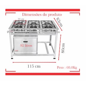 Fogão Industrial 6 Bocas 30x30 P7 em Aço Inox com Forno03 Queimadores Triplos 170mm03 Queimadores Simples 100mmGrelhas em Ferro Fundido Queimadores em Ferro Fundido Estrutura Confeccionada em Aço Inox 430Forno de 92L Tampa em Aço InoxPerfil 7 (7cm Entre os Queimadores) Garantia : 06 Meses Contra Defeitos de Fabricação.Medidas :Altura : 80cmLargura : 115cmProfundidade : 83cm Marca: Não Informado Ean: 7892348075108