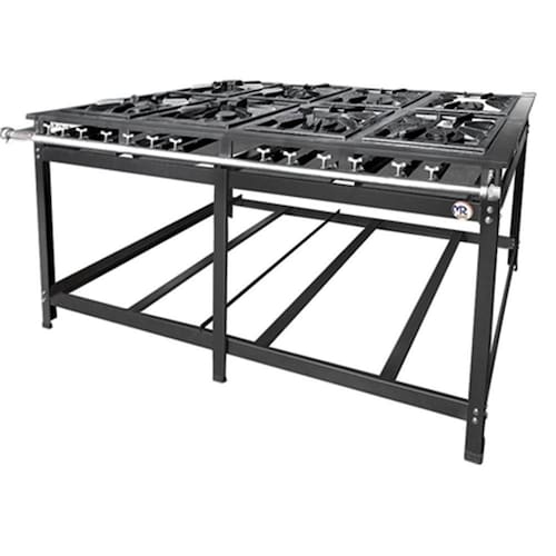 Possui 8 queimadores, sendo 3 duplos de 170mm e 3 simples de 130mm baixa pressão, além de grelhas 40x40 perfil 8 cm confeccionados em ferro fundido, garantindo resistência e qualidade ao fogão 8 bocas industrial. Também conta com registros frontais para ajuste da chama de acordo com a necessidade dos preparos.