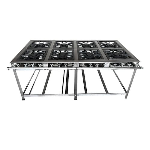 Fogão Industrial de Baixa Pressão À Gás GLP (BOTIJÃO)Linha Tradicional Perfil 7Grelhas em ferro fundido 30cmx30cm8 Queimadores Duplos 170mmBandeja coletora de resíduoChapa em aço Inox 430Medidas do Fogão Montado:Altura : 80cmLargura : 151cmProfundidade : 83cm