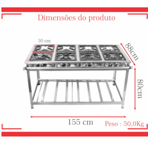 Fogão Industrial de Baixa Pressão à Gás GLP (BOTIJÃO) Linha Inox Mesa Perfil 7 Grelhas em ferro fundido 30x30CM (6 dedos) 4 Queimadores Triplos de 170mm e 4 Simples de 130mm em Ferro Fundido Bandeja coletora de resíduo em Aço Galvanizado Estrutura em aço inox 430 (mesa, pés, paneleiro) Dimensões do Fogão Montado: ALTURA: 81 cm LARGURA: 155 cm PROFUNDIDADE: 88 cm