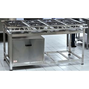 Fogão Industrial de Baixa Pressão à Gás GLP (BOTIJÃO) Linha Luxo Inox Mesa Perfil 8 Grelhas em ferro fundido 40x40CM 8 Queimadores Triplos de 170mm em Ferro Fundido Bandeja coletora de resíduo em Aço Galvanizado Estrutura em aço inox 430 (mesa, pés, paneleiro)