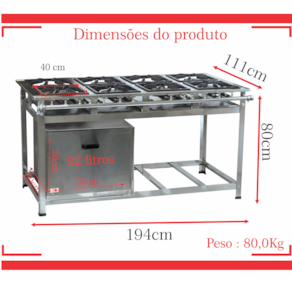 Dimensões do Fogão Montado: ALTURA: 80 cm LARGURA: 194 cm PROFUNDIDADE: 111 cm
