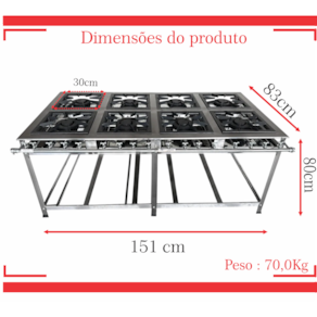 Fogão Industrial de Baixa Pressão À Gás GLP (BOTIJÃO)Linha Tradicional Perfil 7Grelhas em ferro fundido 30cmx30cm8 Queimadores Triplos 170mmBandeja coletora de resíduoChapa em aço Inox 430Medidas do Fogão Montado:Altura : 80cmLargura : 151cmProfundidade : 83cm