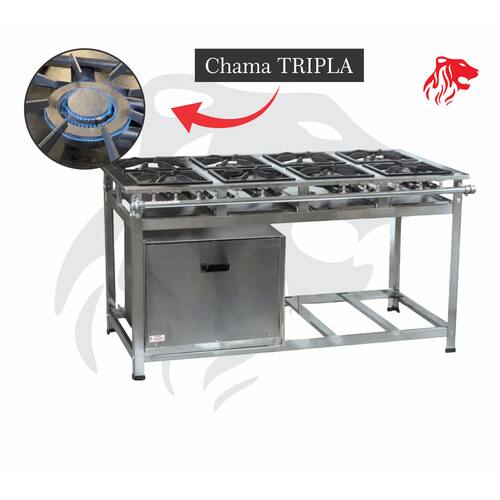 Fogão Industrial de Baixa Pressão à Gás GLP (BOTIJÃO) Linha Luxo Inox Mesa Perfil 8 Grelhas em ferro fundido 40x40CM 8 Queimadores Triplos de 170mm em Ferro Fundido Bandeja coletora de resíduo em Aço Galvanizado Estrutura em aço inox 430 (mesa, pés, paneleiro)