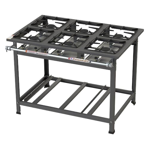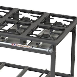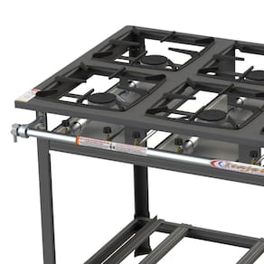 As grelhas são confeccionadas em ferro fundido no tamanho 30x30. O produto apresenta tubo coletor de gás pintado e bandeja coletora de resíduos.