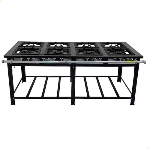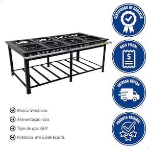 DESCRIÇÃO - O Fogão Industrial Maxi 8 Queimadores Duplo Venâncio é a escolha perfeita para quem busca desempenho e praticidade em cozinhas profissionais. - Com gás GLP de baixa pressão, seus queimadores de ferro fundido oferecem alta potência de até 5.586 kcal/h, com controle individual das chamas no modelo duplo. - O design desmontável facilita o transporte e a armazenagem, enquanto a mesa de aço carbono com acabamento em pintura eletrostática garante resistência e durabilidade. - Ideal para uso industrial, o equipamento também conta com bandeja coletora em aço galvanizado e grela de ferro fundido, oferecendo manutenção e limpeza facilitadas.