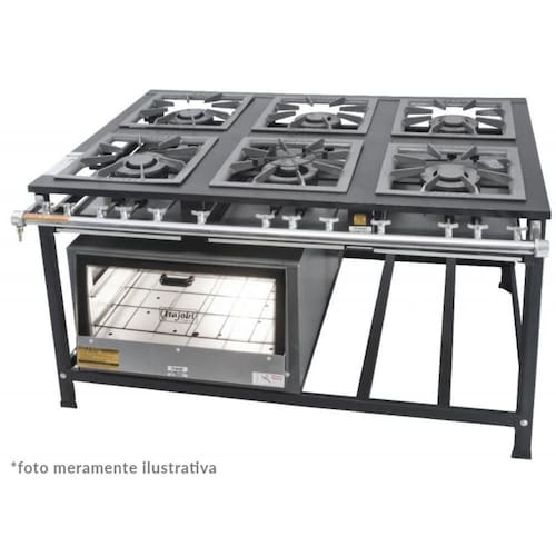 Fogão Industrial Tradicional 40x40 Baixa Pressão 6 Bocas com Forno Itajobi. Ideal para cozinhas, restaurantes, bares e similares. Possui 6 bocas de baixa pressão, sendo: 3 queimadores simples e 3 queimadores duplos, fabricados em ferro fundido. Tubo coletor de gás zincado e bandeja coletora de resíduos. CONSUMO DE GÁS QUEIMADOR SIMPLES: 0,200kg/hr. CONSUMO DE GÁS QUEIMADOR DUPLO: 0,360kg/hr. DIMENSÕES(CxAxL): 152x80x111cm. CAPACIDADE DO FORNO: 87 Litros. Fogão Industrial Tradicional 40x40 Baixa Pressão 6 Bocas com Forno Itajobi é na Atau. Ean: 7793874564923