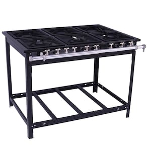 Sua estrutura é confeccionada inteiramente em aço carbono com pintura eletrostática a pó e base fosfatizada e suas grelhas e queimadores em ferro fundido, proporcionando muito mais durabilidade e resistência ao equipamento. Conta com tubo distribuidor (varão) de 3/4' cromado e tampão e entrada de gás reversível, registro cromado de 1/4', além de ser totalmente desmontável para facilitar o transporte e armazenamento. Este fogão 6 bocaspossui 3 bocas simples e 3 duplas, além de queimadores com excelente rendimento, sendo 1.938 kcal/h pra queimadores simples e 4.959 kcal/h para os duplos.