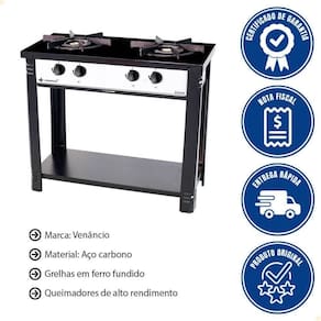 - O Fogão Industrial Venâncio Bravo 2 Bocas entrega alto desempenho, estrutura robusta e mesa esmaltada, que facilita a limpeza e garante maior durabilidade.