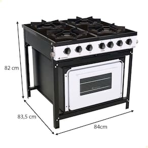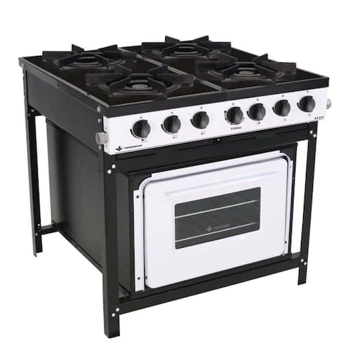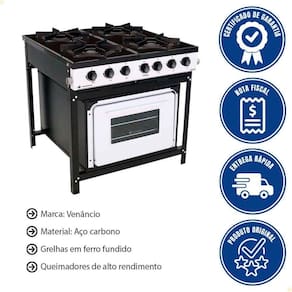É um fogão industrial com forno, ideal para cozinhas profissionais, restaurantes, padarias e estabelecimentos que exigem alto desempenho e durabilidade.