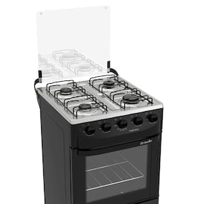 Características: Tampa de vidro temperado. Mesa em inox. Botões removíveis. Queimadores de aço esmaltado. Painel ergonômico. Pés altos. Encaixe dos queimadores vedado à mesa. Um queimador Família - 2KW Três queimadores Médios - 1,7KW Queimador do forno - 1,9KW Puxador do forno em metal com abertura ergonômica. Forno total clean com amplo visor. Forno com uma grade ajustável em dois níveis de altura. Proteção térmica com duplo vidro no forno. Forno com válvula de segurança.