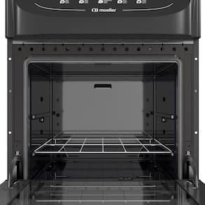 Tipo de acendimento: Acendimento automático total, na mesa e no forno | Largura (cm): 48,5cm | Altura (cm): 87cm | Peso (Kg): 19,75Kg | Cor: Preto Fosco | Queimadores: de aço esmaltado em preto fosco | Marca: Mueller | Voltagem: Bivolt | Tipo de fogão: A Gás, de Piso | Mesa: Em vidro temperado | Prateleiras do forno: Uma grade ajustável em dois níveis de altura | Porta do Forno: De Vidro