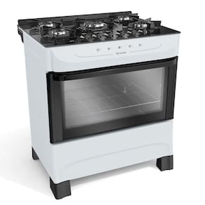 Tipo do Fogão: A Gás, de Piso | Altura (cm): 87cm | Largura (cm): 75cm | Peso (Kg): 27,55Kg | Cor: Branco | Marca: Mueller | Voltagem: Bivolt | Mesa: Em vidro temperado | Prateleiras do forno: Uma grade ajustável em dois níveis de altura | Tipo de acendimento: Acendimento automático total, na mesa e no forno | Porta do Forno: De Vidro