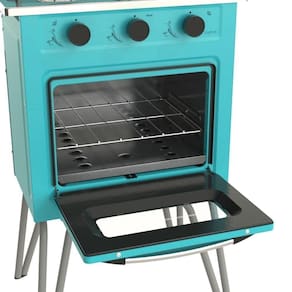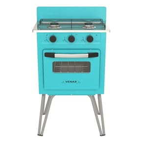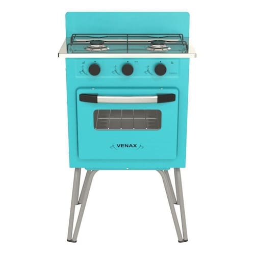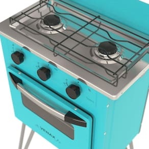 Fogão portátil Venax Gemini Vetrô a gás GLP, com 2 queimadores médios, trempes esmaltadas, mesa em inox, botões removíveis e porta do forno com visor incolor.Tipo