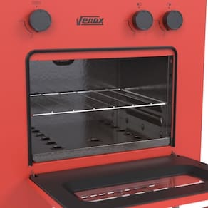 Fogão portátil Venax Mini Cook GLP com 2 queimadores médios, mesa em vidro, botões removíveis e forno com revestimento Easy Clean e 22L de capacidade.Tipo