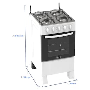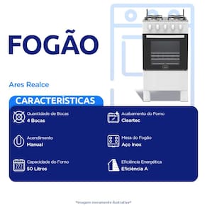Características: Mesa: Aço inox selada; Queimadores: Esmaltados; Modelo: Ares; Queimador rápido: 1; Queimadores semi rápidos: 3; Capacidade do Forno: 50 Litros; Forno: Easy clean; Puxador da porta do forno: Tubo metálico;