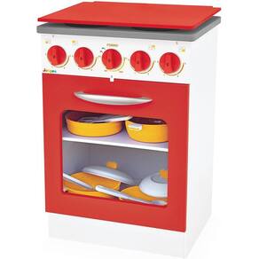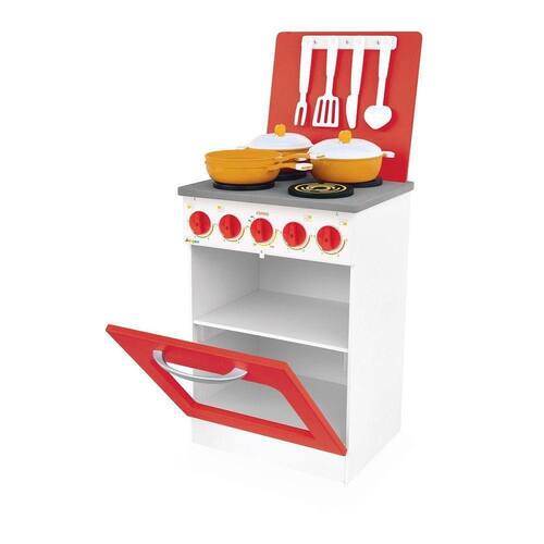 Fogão em madeira de MDF, montado e decorado, com pintura atóxica Produto com porta abre e fecha com compartimento para guardar as panelinhas Acompanha kit de panelinhas e talheres em plástico Puxador ergonômico e botões que giram Idade indicada: 4+ anos Dimensões do produto: 32x26x71 cm Dimensões da embalagem: 33x27x74 cm Peso do produto: 5,830 kg INMETRO CE-BRI/INNAC 00671-001