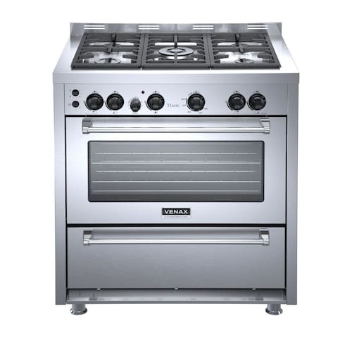 Marca: Venax Modelo: Temis Ref.: 29064 Cor: Inox Voltagem: 127V Frequência: 60Hz Classificação Energética: ?A? Tipo: Fogão de Piso Volume do Forno: 88,3L Acendimento: Automático Queimadores: 1 Tripla chama, 1 Grandes e 3 Médios Trempe dos Queimadores: Dupla em Ferro fundido esmaltada Mesa Queimadores: Aço Inox 304 Escovado Botões: Removíveis Válvula de Segurança: Sim Luz no Forno: Sim Prateleiras do Forno: Duas Auto Deslizantes Revestimento do Forno: Esmalte Easy Clean Temperatura: 5 posições de 180°C Até 290°C Função Grill: Sim Timer Grill: Sim Timer Gás: Não Espeto Giratório: 2 Espetos Removíveis Bandeja Coletora de Resíduos: Sim Porta Removível: Sim Porta do forno: Aço Inox 304 Escovado + Visor em vidro Vidro Duplo na Porta: Sim Puxador da Porta: Aço cromado Estufa: Móvel Puxador da Estufa: Aço cromado Entrada de Gás: Uma Entrada (Lado Esquerdo Visto de Frente) Cores das Laterais: Aço Inox 304 Escovado Alimentação: Gás GLP (A conversão para Gás Natural não é coberta pela garantia) Etiquetas: ENCE e CONPET Potência do Grill:1250W Potência do Queimador do Forno: 3,30kW Potência Queimadores Mesa: 3,0 kW (tripla chama); 1,80 kW (Queim.Grande); 1,35 kW (Queim.Médio)