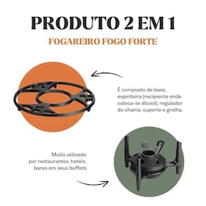 Fogareiro Fogo Forte fabricado em ferro fundido, indicado para preparos que exigem alta potência, estabilidade e segurança. Sua estrutura robusta proporciona excelente distribuição do calor e resistência ao uso contínuo. O regulador de chamas permite controle preciso da intensidade do fogo, enquanto o aparador garante firmeza no apoio de panelas e utensílios durante o preparo. Ideal para cozinhas profissionais e também para uso doméstico, oferecendo desempenho confiável e longa durabilidade.