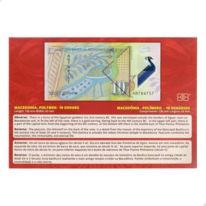 Folder Encarte para Cédula de 10 Denários Banco Nacional da Rep. da MacedôniaO Folder Encarte para Cédula de 10 Denários Banco Nacional da Rep. da Macedônia descreve com detalhes os vários elementos que compõem a cédula de 10 Denários Banco Nacional da Rep. da Macedônia, além de apresentar as cores reais dessa cédula.Para armazenar a cédula, você deve abrir o plástico pela lateral esquerda e então ajustar a cédula. Este anúncio NÃO inclui a cédula.Informações Técnicas:Dimensão Fechada: L: 20cm x A: 14,3cmDimensão Aberta: L: 20cm x A: 28,6cm Marca: Banco Colecionável do Brasil