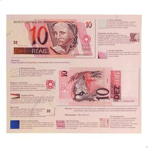 Folder Encarte para Cédula de 10 Reais DescritivoO Folder Encarte para Cédula de 10 Reais Descritivo descreve com detalhes os vários elementos que compõem a cédula de 10 reais da primeira família, além de apresentar as cores reais dessa cédula.No folder são apontados os elementos de impressão em alto-relevo, fibras coloridas, fundos especiais, microimpressões, microchancelas, imagem latente, marca tátil, registro coincidente, fibras luminescentes, fio de segurança, numeração, dimensões, listagem com informações de chancelas entre 1994 a 2010 e descrição do anverso e reverso.O folder tem espaço reservado para colocar 1 (um) cédula de 10 reais da 1ª Família em 1 (um) espaço plástico que é localizada na parte interna do material; a abertura do plástico é feita pela lateral esquerda dele. Para colocar sua cédula você deve abrir o plástico pelo lado citado e inserir a cédula com cuidado.CARACTERÍSTICAS DO FOLDERComprimento: 19,7cmLargura folder fechado: 22,5cmEspaço para 1 cédula de 10 reais da 1ª FamíliaNÃO ACOMPANHA CÉDULA Marca: Numismática Completei