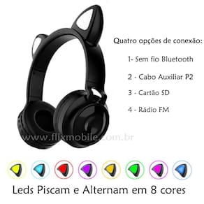 Fone de Ouvido Sem Fio Orelhas de Gato 8 Cores de LED Headset Gatinho Bluetooth Preto Fone com Orelhas de Gatinho com LEDs ColoridosO headphone orelha de gato Bluetooth possui excelente qualidade de som, design diferente e iluminação de Led que deixa o produto mais divertido. Compatível com qualquer dispositivo e aparelho com tranmissao de Bluetooth, como smartphones, tablets e computadores ou que tenha saída de cabo auxiliar P2.O headfone HF-C290BT exbom tem o função de atender chamadas do seu aparelho smartphone via conexão bluetooth. Basta fazer o pareamento com seu smartphone ou dispositivo com bluetooth, além disso conta com a função de repareamento automatica, basta uma vez conectado que ele vai ser conectado automaticamente sem necessidade de um processo de pareamento.Recursos: - Microfone Embutido- Radio FM- Entrada Cartão SD- Controle de volume- Botão de avançar e retroceder- Leds alternam em 8 Cores diferentes- Arco com regulagem de tamanho dobrávelEspecificações técnicas:Marca: ExbomModelo: Hf-C290BtInterfaces de Conexões: Bluetooth sem fio , Cabo P2, FM e CartãoComprimento do cabo: 1,5 m Auxiliar P2 Bateria: 360mAhAutonomia: De 3 a 4 horasCarregamento: UsbItens Inclusos:1 x Headphone orelhas de gato 1 x Cabo USB para carregar 1 x Cabo Axiliar P2/P2
