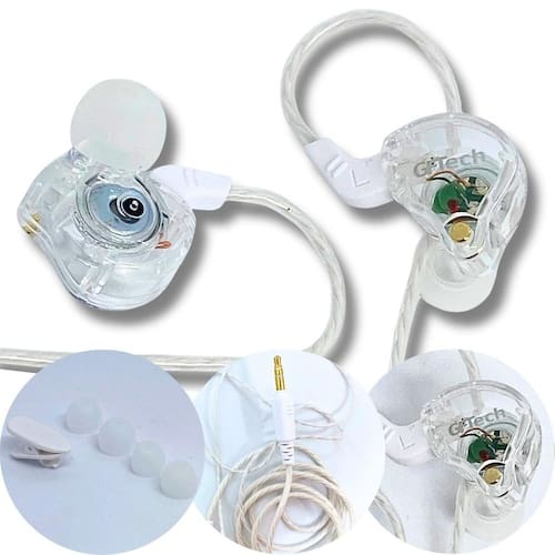 - driver duplo para separação clara de graves e agudos - som de alta definição ideal para retorno de palco e estúdio - isolamento passivo que reduz ruídos externos - design anatômico com encaixe firme e confortável - cores translúcidas com acabamento elegante - cabo resistente e removível com conector padrão 3,5 mm - compatível com monitores, mesas de som e dispositivos móveis