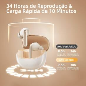 34 horas de reprodução Com o design de economia de energia, você pode reproduzir por mais de 8,5 horas contínuas apenas com os fones de ouvido e, junto com a caixa de carregamento, pode reproduzir por até 34 horas.