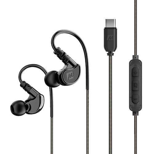 MEE audio Fones de ouvido M6 Sport USB-C com fio de memória, fones de ouvido intra-auriculares com isolamento de ruído para corrida/academia/exercícios, fone de ouvido USB tipo C com microfone e controle remoto de 3 botões - Drivers dinâmicos de alto desempenho proporcionam desempenho superior de graves, médios vívidos e agudos cristalinos para uma experiência de áudio enérgica que o motiva através dos exercícios mais intensos - Os ganchos de ouvido com fio de memória ajustáveis se adaptam perfeitamente aos seus ouvidos, proporcionando um ajuste ergonômico e seguro sobre a orelha que permanece confortável o dia todo e nunca cai - Fone de ouvido embutido + conector USB tipo C compatível com iPads, smartphones/tablets, Macbooks, laptops/computadores e outros dispositivos com áudio USB-C; microfone incorporado e controle remoto de 3 botões permitem que você faça chamadas, controle a reprodução de música e ajuste o volume - O design IPX5 resistente ao suor e à água evita danos do suor e dos elementos para durabilidade superior e liberdade de malhar em qualquer lugar - Inclui estojo de transporte para armazenamento e transporte convenientes, clipe de camisa para gerenciamento de cabos e 6 conjuntos de fones de ouvido para um ajuste personalizado; tente todos os tamanhos de pontas para encontrar os que têm o melhor som geral, baixo e conforto para seus ouvidos